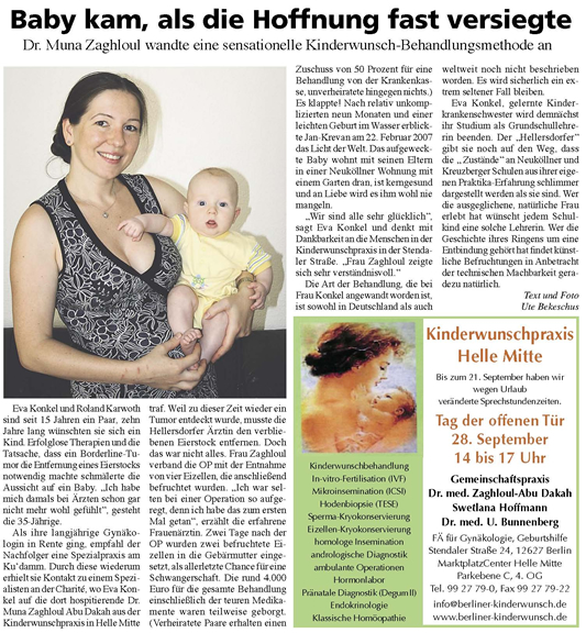 "„Wir sind alle sehr glücklich“, sagt Eva Konkel und denkt mit Dankbarkeit an die Menschen in der Kinderwunschpraxis in der Stendaler Straße. „Frau Zaghloul zeigte sich sehr verständnisvoll.“ Die Art der Behandlung, die bei Frau Konkel angewandt worden ist, ist sowohl in Deutschland als auch weltweit noch nicht beschrieben worden. Es wird sicherlich ein extrem seltener Fall bleiben..."